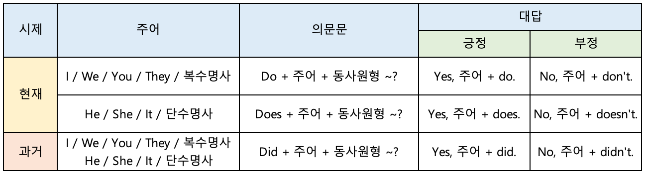 대답: Yes, I do. 네. / No, I don't. 아니요.