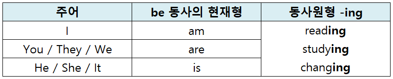 - [예문] 주어 + be 동사 + 동사원형 -ing